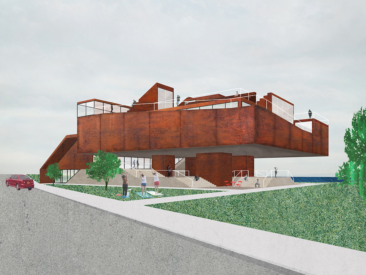 As a ferry terminal, kitchen incubator, and marketplace for Clason Point, Living Theater turns a nexus of physical and commercial exchange into a space of performance and spectatorship. Living Theater posits public space as a theater of everyday life. The building constructs moments of performative action and spectatorship primarily through sectional differentiation: employing flat platforms as stages while raised steps serve as seating for observation. The tectonic form of the building allows for this sectional denotation of performance/spectatorship. The building is an elevated mass that rests on four structural and circulatory cores. This structural system enables an unobstructed free plan that is transformed into a free section. In raising the warehouse and kitchen incubator/co-working space, the ground beneath the building becomes a public plaza. The ground level is an open array of platforms and stairs that double as stages and seating, respectively. The platforms directly under the building become a covered marketplace and open social space for impromptu events and performances, while the eastern edge of the ground floor serves as the ferry terminal boarding area. Within the building mass itself, the plan remains open to enable visual continuity and fluidity in moving between areas of performance and spectatorship. Despite the openness of the plan and section, however, Living Theater is not a neutral container for events, but employs the specific constraints of architectural form to influence user activity towards the performative. As a building that turns everyday event into theater, narrative fiction is not only an important means of representation but also a generative tool for design. These narratives scripts dictate an experiential procession in which users undergo fluid shifts between performing and spectating, vignettes which then become physicalized as built form; thus, the building becomes the physical artifact of the narratives it generates.